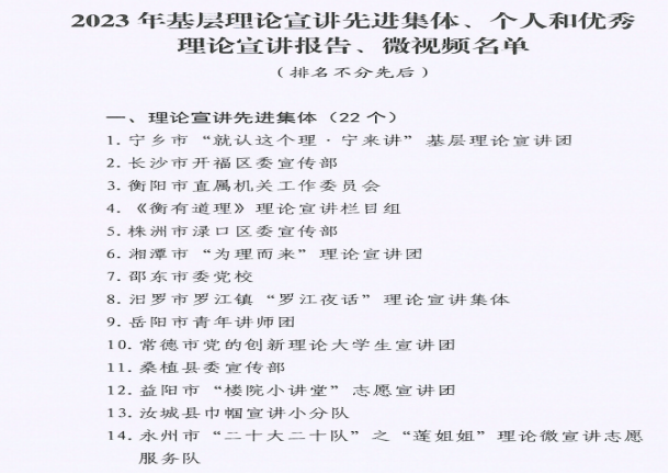 近日,中共湖南省委宣传部印发了《关于表彰2023年基层理论宣讲先进集体、个人和优秀理论宣讲报告、微视频的决定》(湘宣办[2023]7号),304永利集团官网入口荣获全省理论宣讲先进集体。